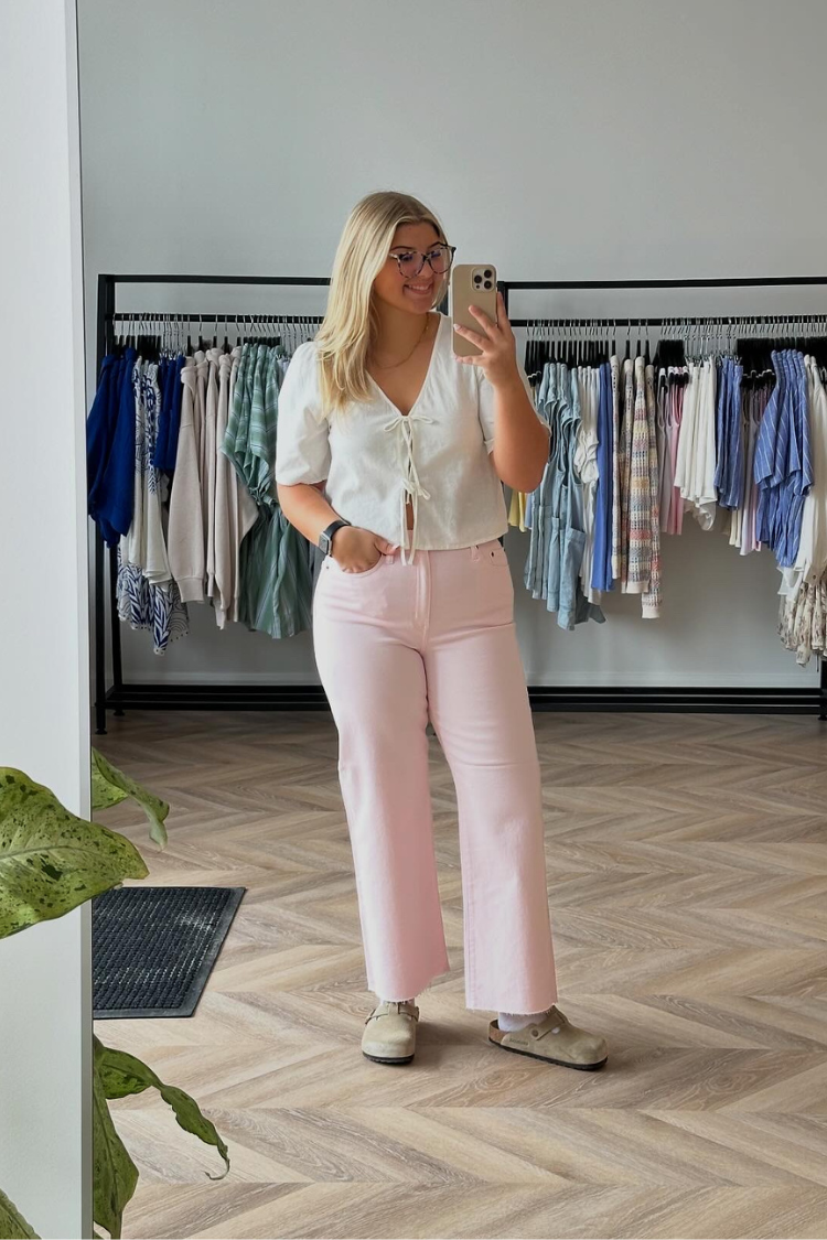 This version of the Pleaser brings the same waist-cinching, leg-lengthening silhouette but in a soft, pretty pink wash that instantly brightens your outfit. The high rise shapes the waist, while the wide ankle leg feels modern and flattering. Made from our comfort stretch denim, it has just enough give to move with you while still holding everything in.