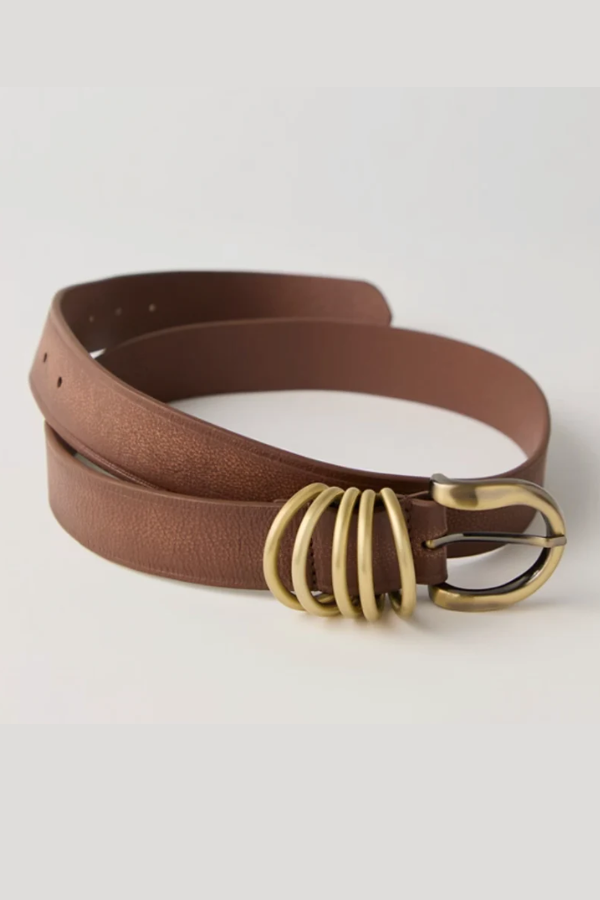 Pull things together in this classic leather belt featuring gold hardware with ring details on the side.