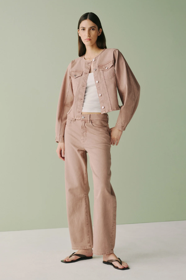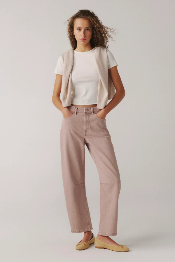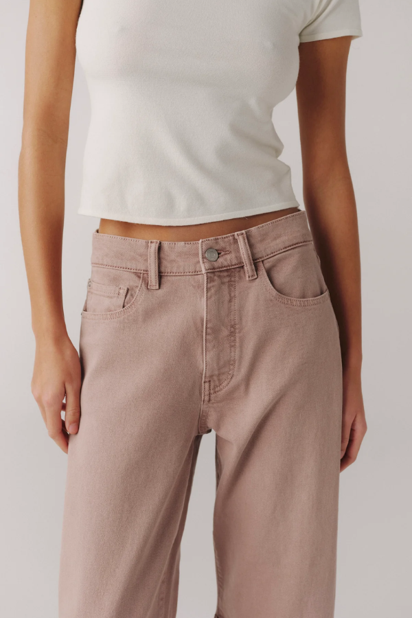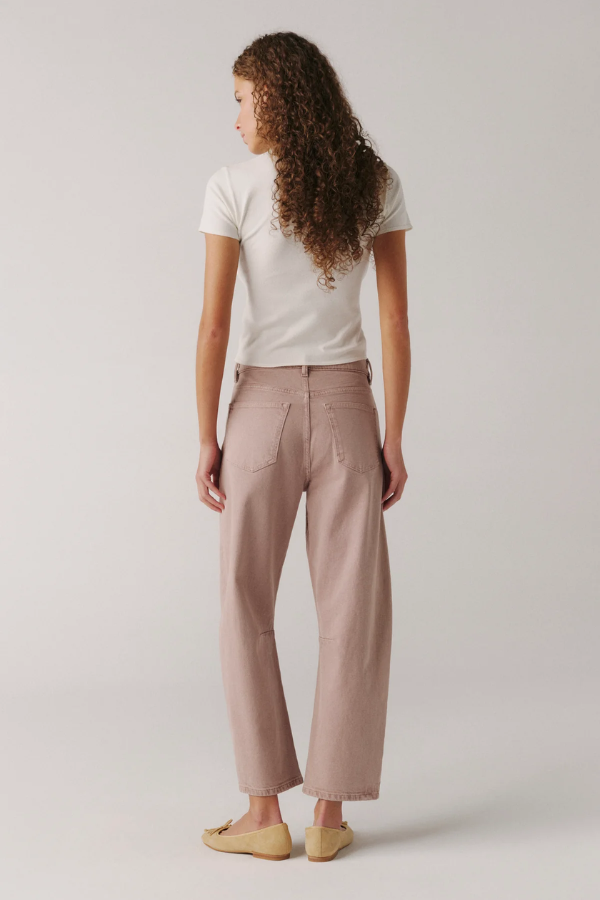 Rosewood is an overdyed light mauve denim finished with vintage brushed silver hardware and tonal stitching for a modern, elevated take on colored denim.