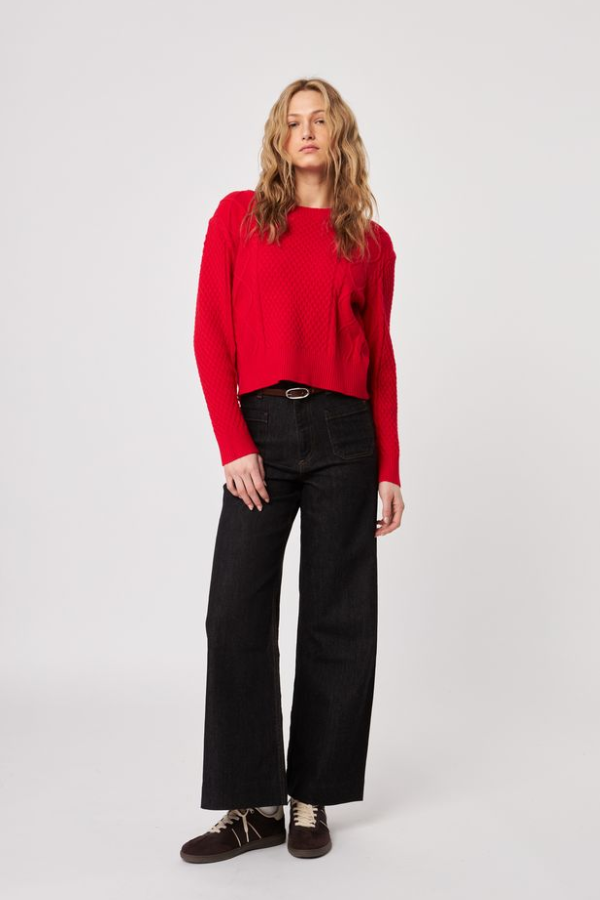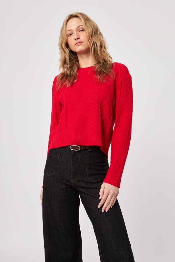 Discover effortless style with this vibrant poppy red cable knit sweater. The relaxed, boxy silhouette offers comfortable everyday wear without sacrificing sophistication. Perfect for layering or wearing solo, this lightweight knit transitions seamlessly from season to season, making it an essential addition to any wardrobe.