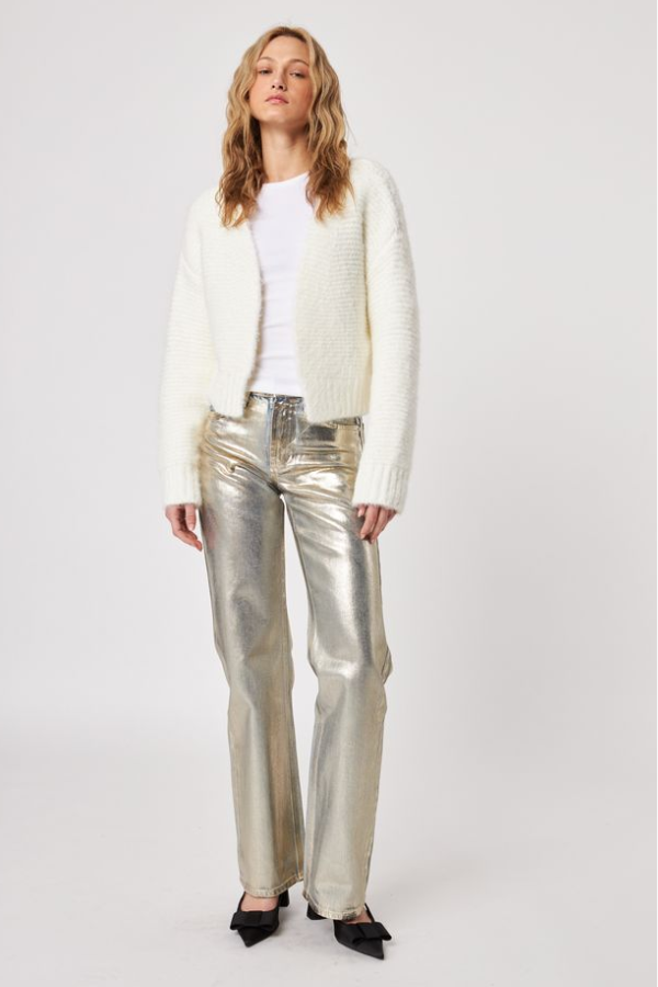 This off-white cardigan is luxuriously knit with a roomy, boxy fit for easygoing style. Shown here in size small, it’s as comfy as it is chic.