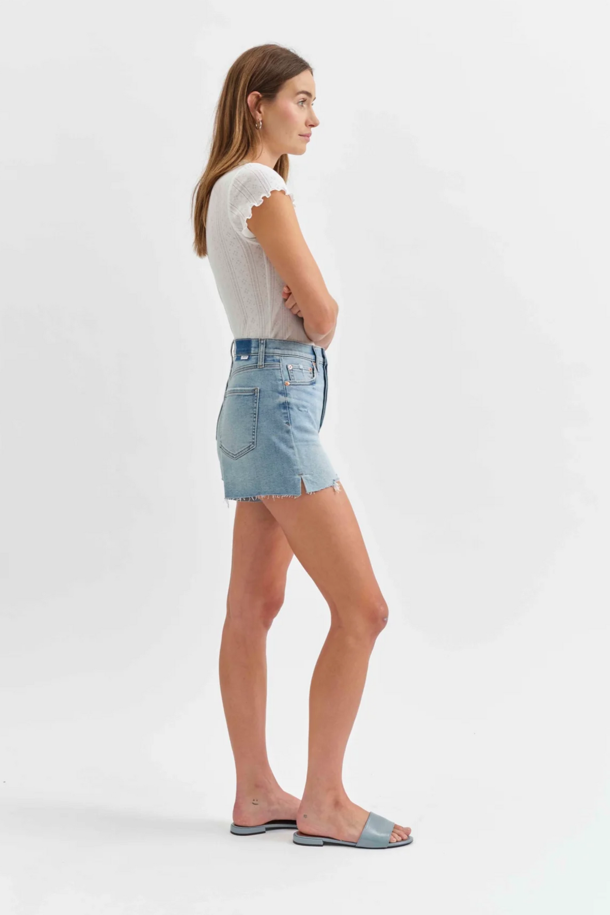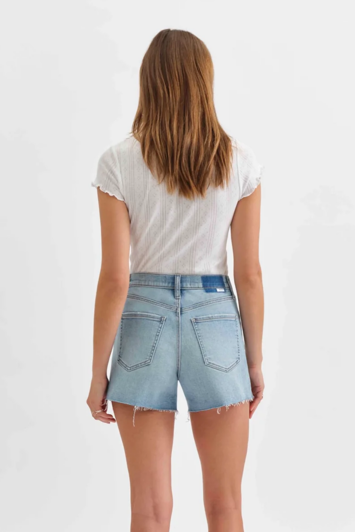 A slightly longer denim fit that brushes your fingertips. This high rise, vintage inspired short is in a medium wash, with whiskering and a cut off hem. Crafted from our "Stretch" denim that hugs your body, but has just enough weight to keep a structured fit.