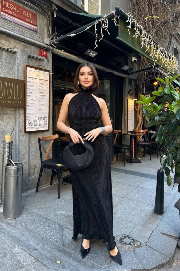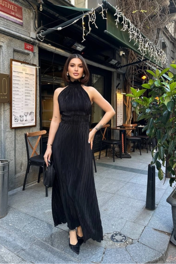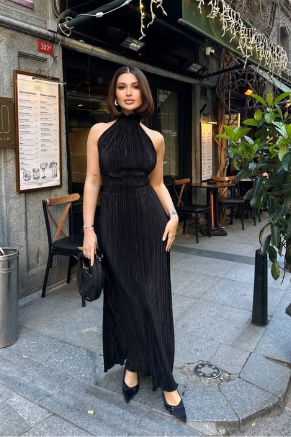 The Ethereal Pleated Halter Maxi Dress exudes grace and sophistication with its fluid, lightweight design. Featuring a high halter neckline with delicate ruffle detailing, this dress offers an effortlessly elegant look. The pleated fabric creates soft movement, while the open-back tie detail adds a subtle, alluring touch. The cinched waist accentuates the silhouette, making this piece the perfect blend of timeless charm and modern femininity.