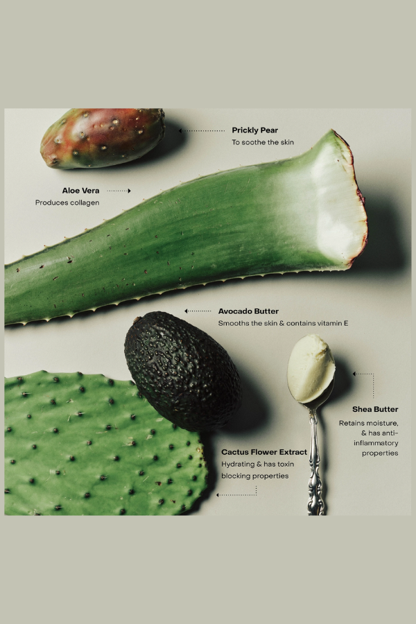 Ingredients: Water (eau), Glycerin, Shea Butter Ethyl Esters, Capryloyl Glycerin/Sebacic Acid Copolymer, Aloe Barbadensis Leaf Juice, Phenoxyethanol, Diheptyl Succinate, Sodium Acrylate/Sodium Acryloyldimethyl Taurate Copolymer, Ammonium Acryloyldimethyltaurate/VP Copolymer, Polyisobutene, Fragrance (Parfum), Polyglyceryl-10 Diisostearate, Sodium Phytate, Caprylyl/Capryl Glucoside, Sorbitan Oleate, Citric Acid, Caprylyl Glycol, Opuntia Ficus-Indica Seed Oil, Hydrogenated Vegetable Oil, Persea Gratissima (Avocado) Oil, Potassium Sorbate, Sodium Benzoate, Cereus Grandiflorus (Cactus) Flower Extract, Tocopherol